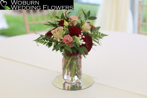 Pale pink vase containing Roses, Gypsophilia, Gerbera and Lisianthus.